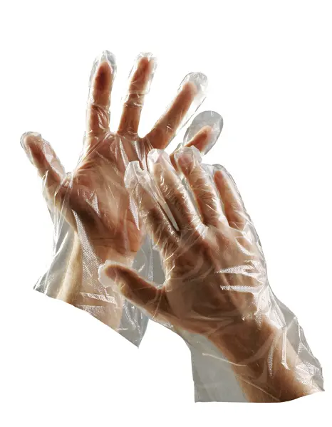 Jednorázové rukavice z tenké polyetylénové fólie, balení po 100 ks, vhodné pro krátkodobý styk s potravinami.