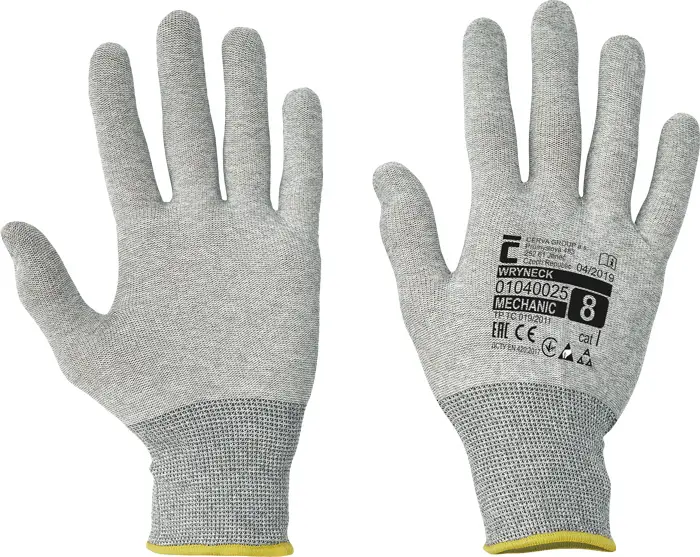 Pletené bezešvé ESD nylonové rukavice, s karbonovými vlákny a elastickou manžetou. Velikosti: 7,8,9,10
