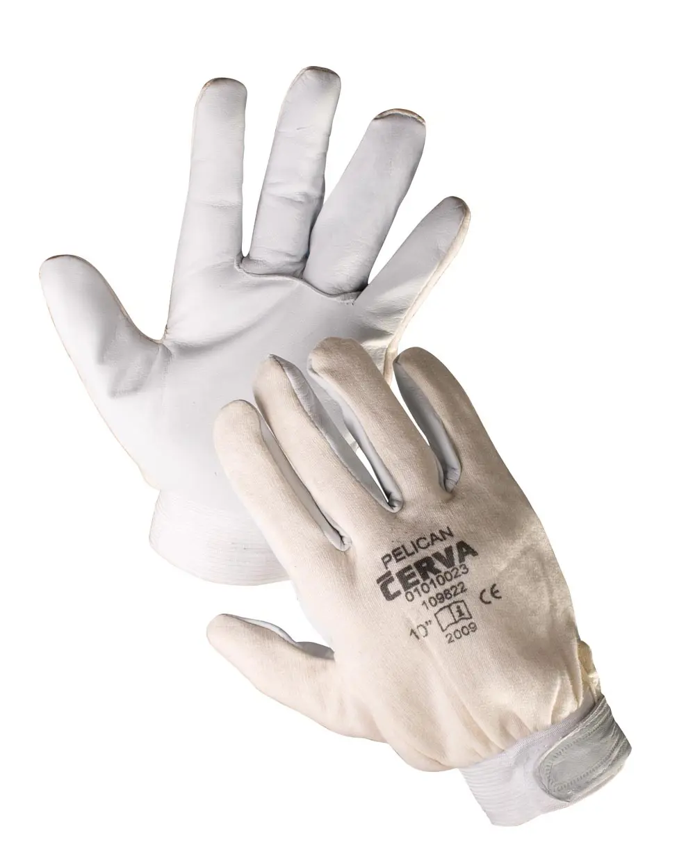 Kvalitní rukavice, dlaň z jemné lícové kozinky, hřbet z bílé bavlněné tkaniny a pružná manžeta se suchým zipem na zápěstí