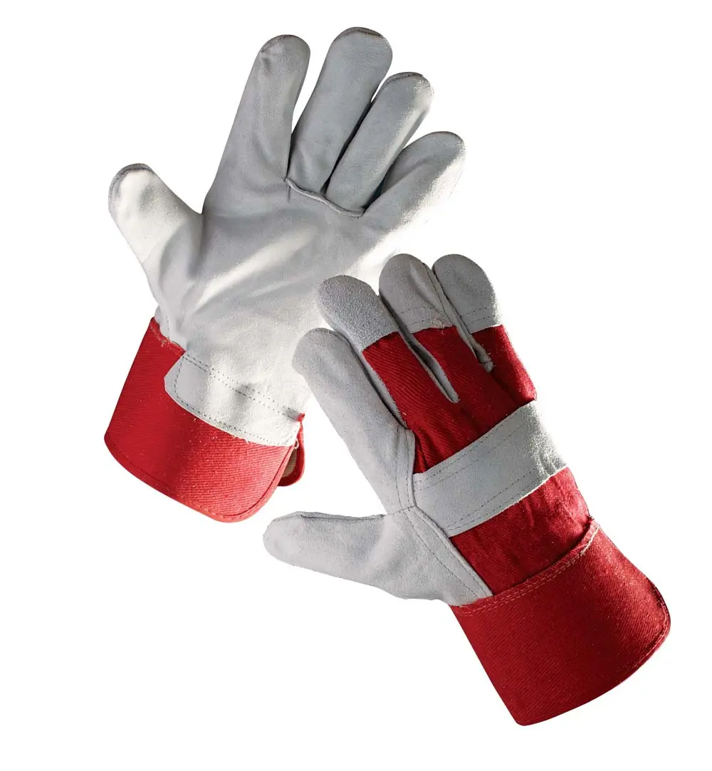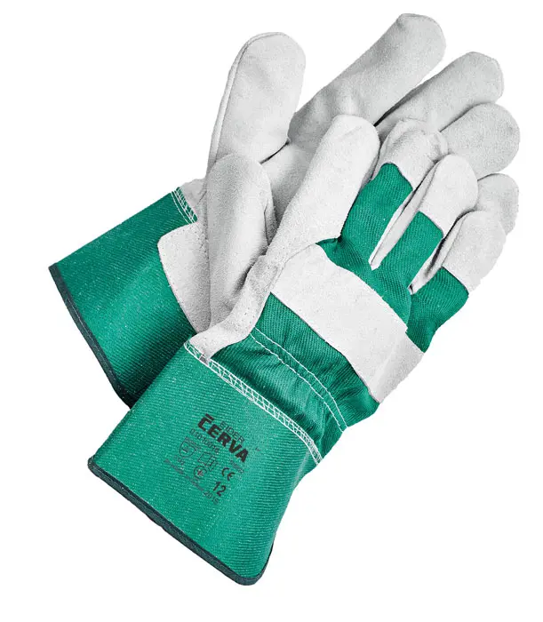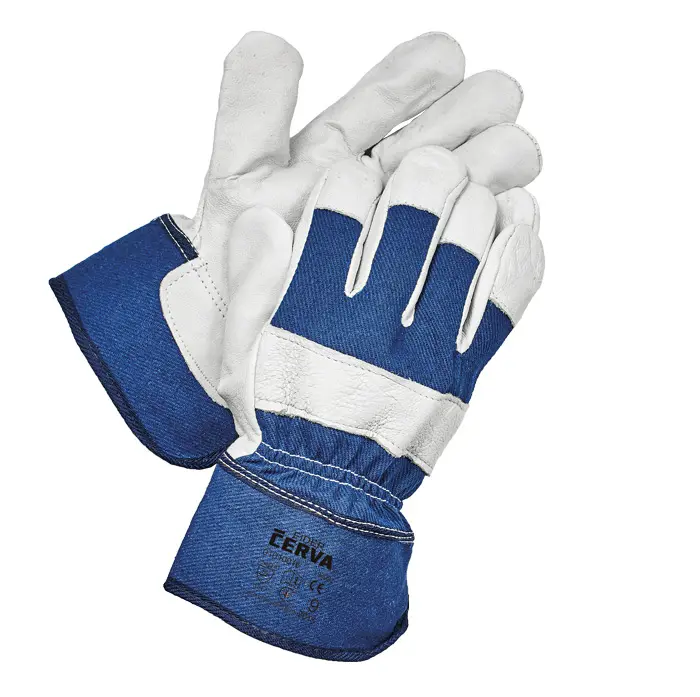 Rukavice z jednoho kusu silné hovězí štípenky v dlani s podšívkou, bavlněné tkaniny na hřbetu, s bavlněnou vyztuženou manžetou, celokoženými palci a ukazováčky a překrytými špičkami prstů.