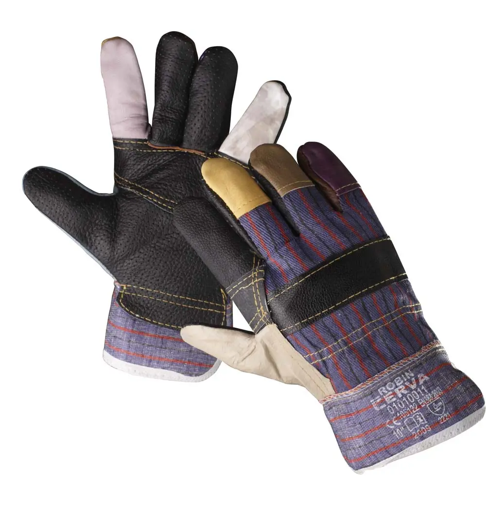 Rukavice kombinace textil/kůže. Dlaň z různobarevné odolné lícové nábytkové hověziny, hřbet a manžeta z pruhované bavlněné tkaniny, podšívka ve dlani.