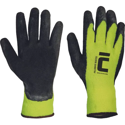 Zateplené bezešvé pletené rukavice ze syntetické neonové příze s vrstvou mikroporézního paropropustného pěnového latexu v dlani a na prstech a pružným nápletem na zápěstí.