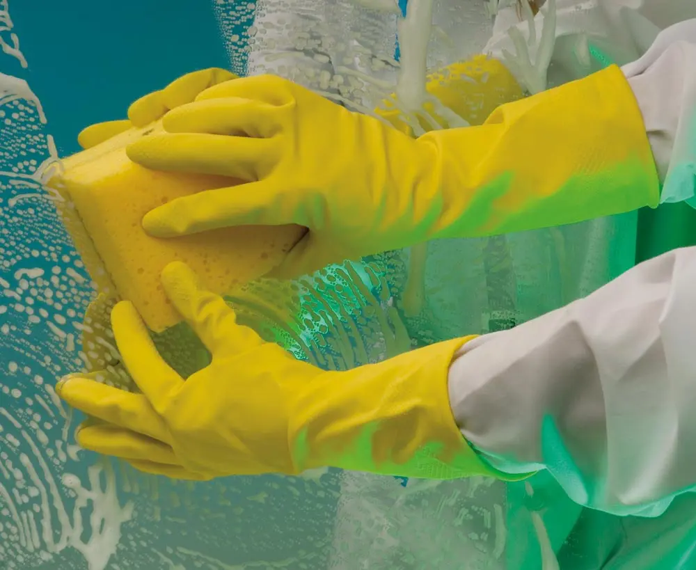 Latexové úklidové rukavice, velurová úprava vnitřního povrchu, protiskluzové struktury na dlani a prstech.