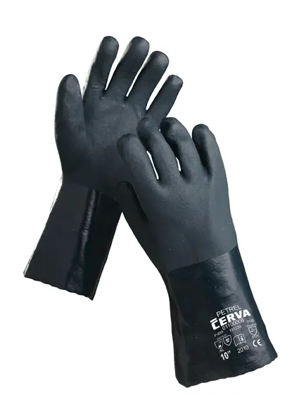 Rukavice šité z bavlněné teplákoviny, máčené v PVC, s protiskluzovou úpravou, v celkové délce 35 cm.