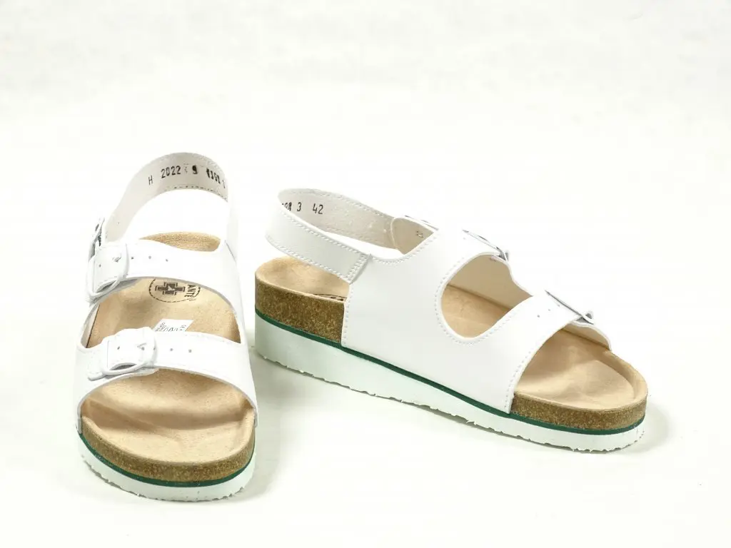 Dámský bílý sandál na klínku, z mikrovlákna, pohodlná obuv s koženou stélkou. Protiskluzová podešev a nezanechává šmouhy na povrchu. Nastavitelná šíře obuvi - na dvě pžezky a nastavitelné přes patu- přezka. Certifikovaná pracovní obuv.