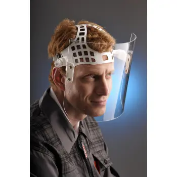 Ochranný štít o velikosti 220 x 290 mm z čirého PMMA tl. 2 mm je typem štítu s náhlavním nosičem. Určen k ochraně očí a obličeje proti nárazu pomalu letících částic s dopadovou energií max. 0,56 J. Umožňuje současné použití korekčních brýlí.