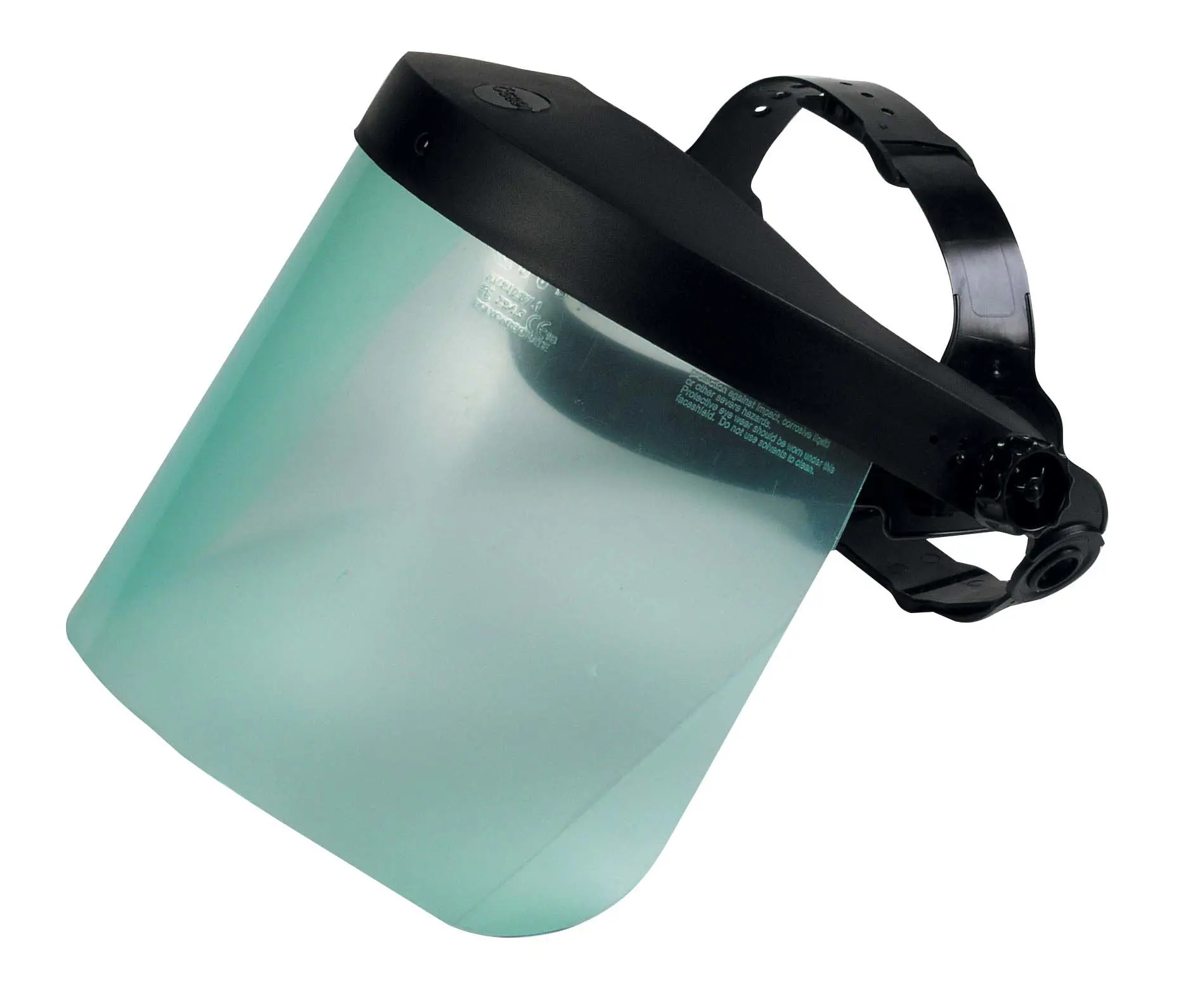 Čirý celoobličejový štít s náhlavním držákem a vyměnitelným zorníkem, zorník třídy F