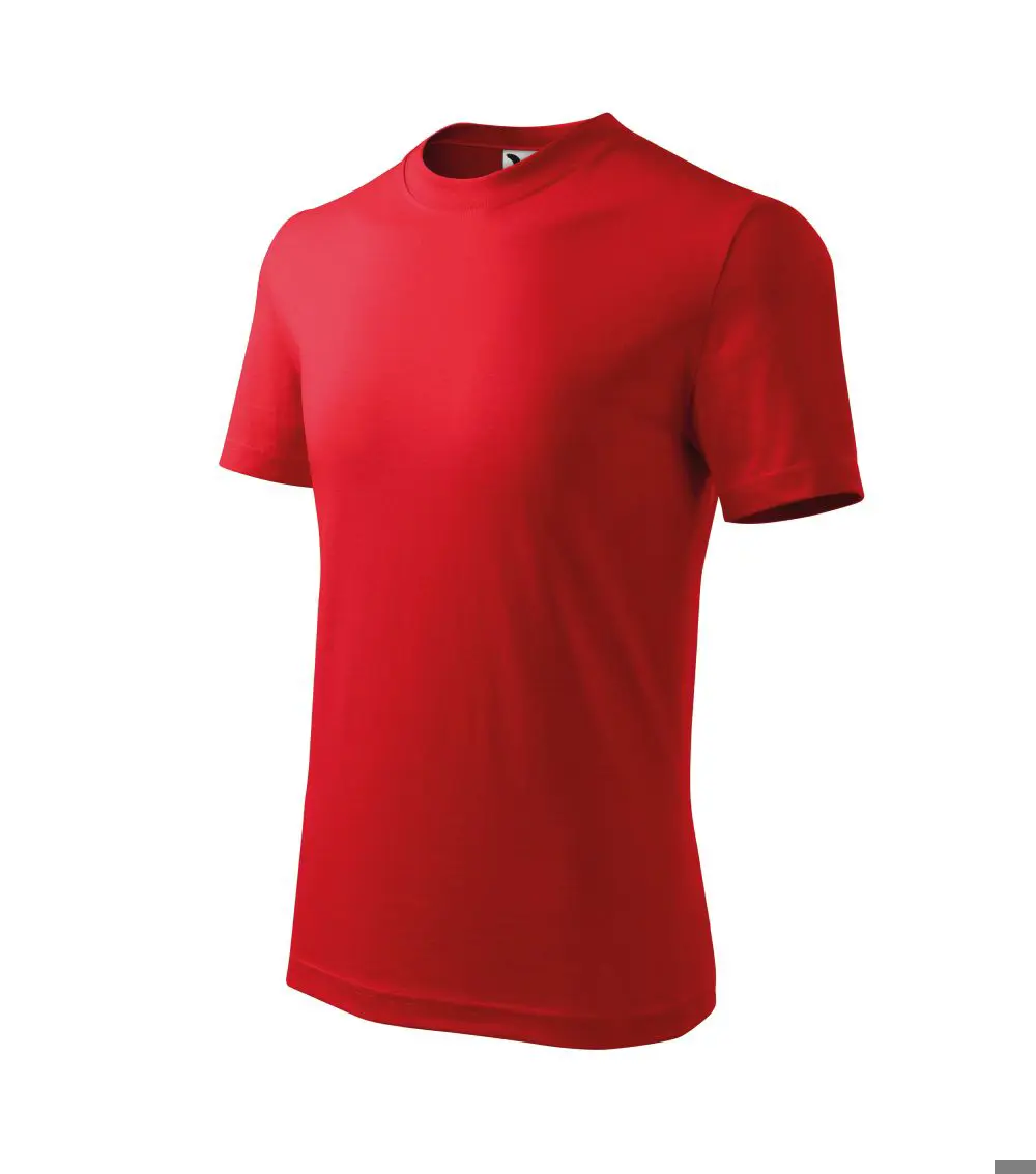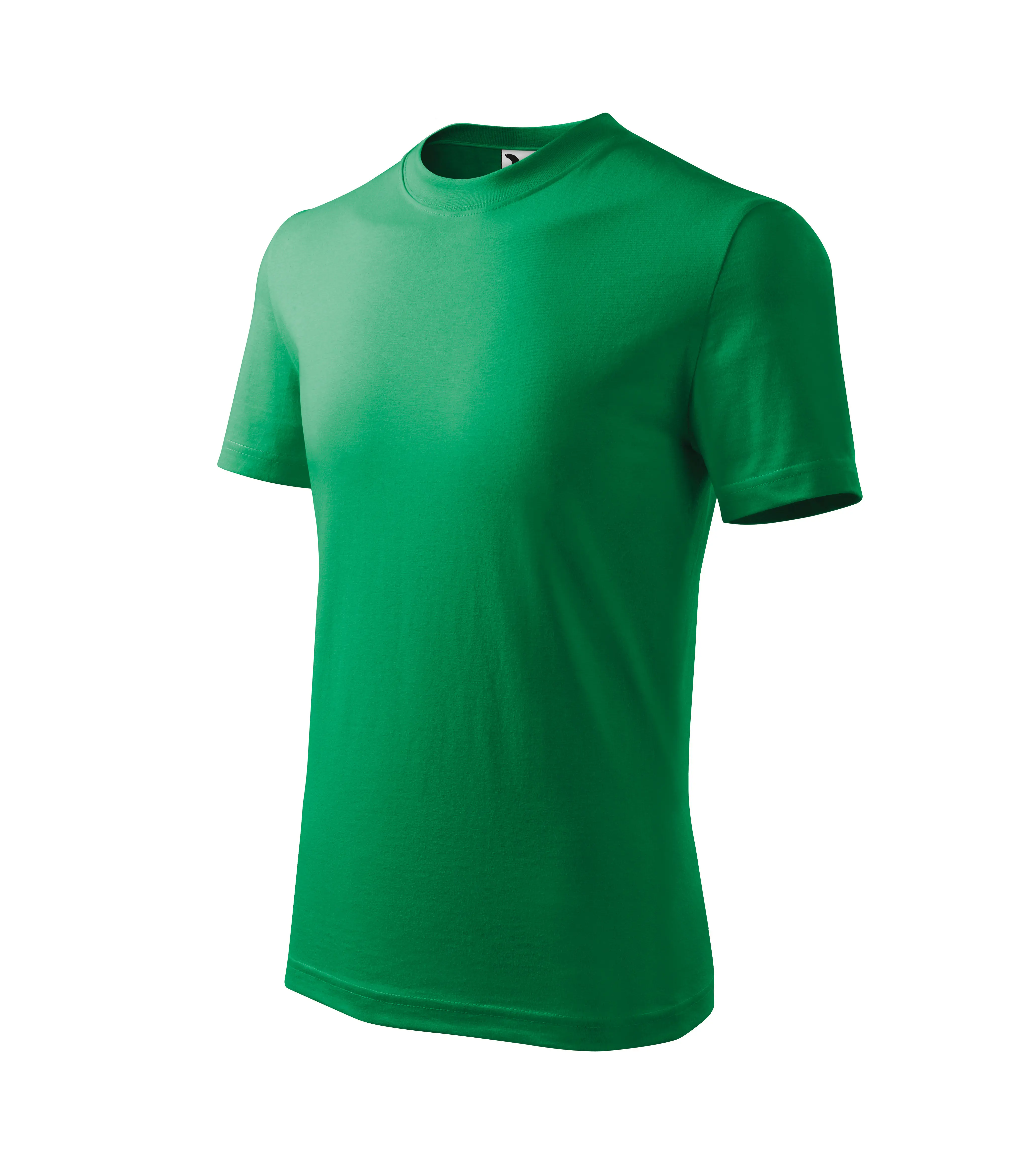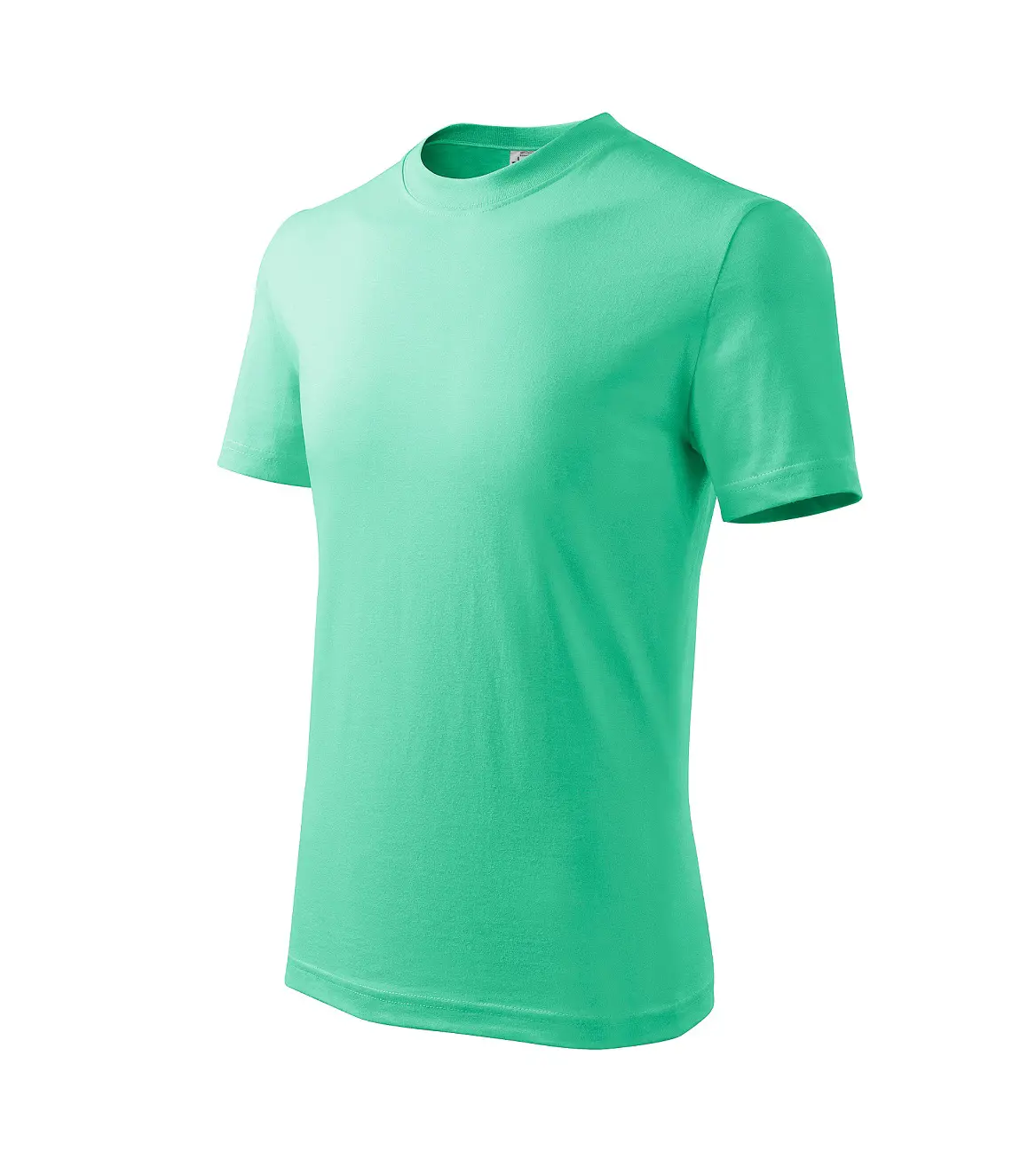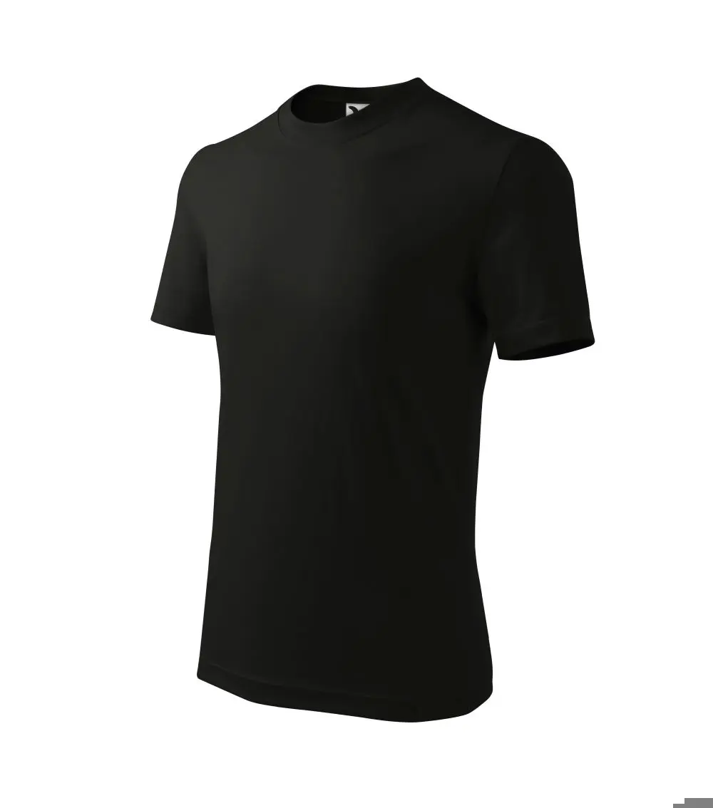 Dětské tričko s krátkým rukávem, úzký průkrčník s přídavkem 5 % elastanu. Vnitřní část zadního průkrčníku začištěna tkanou páskou. Zpevněný ramenní šev, silikonová úprava materiálu