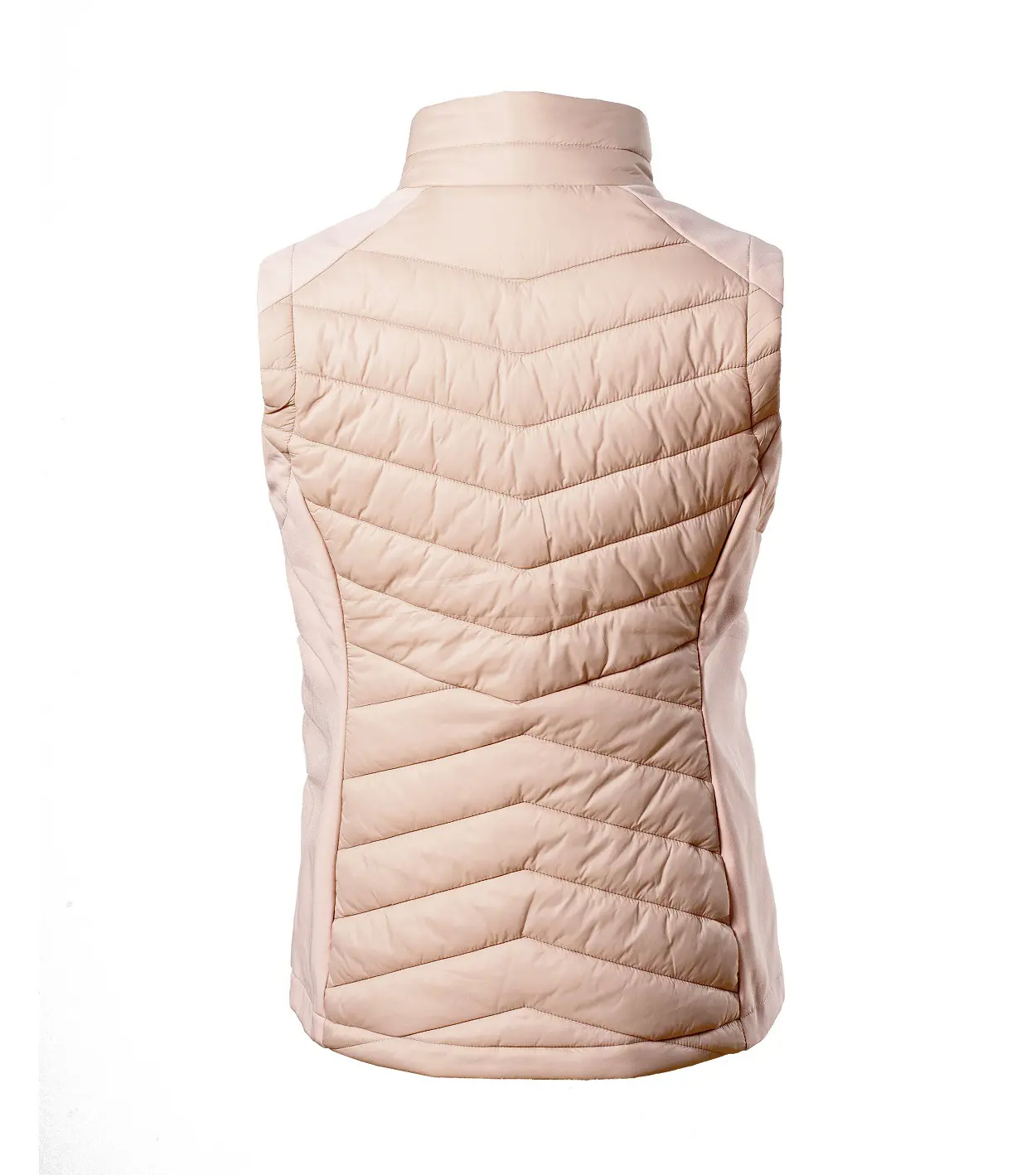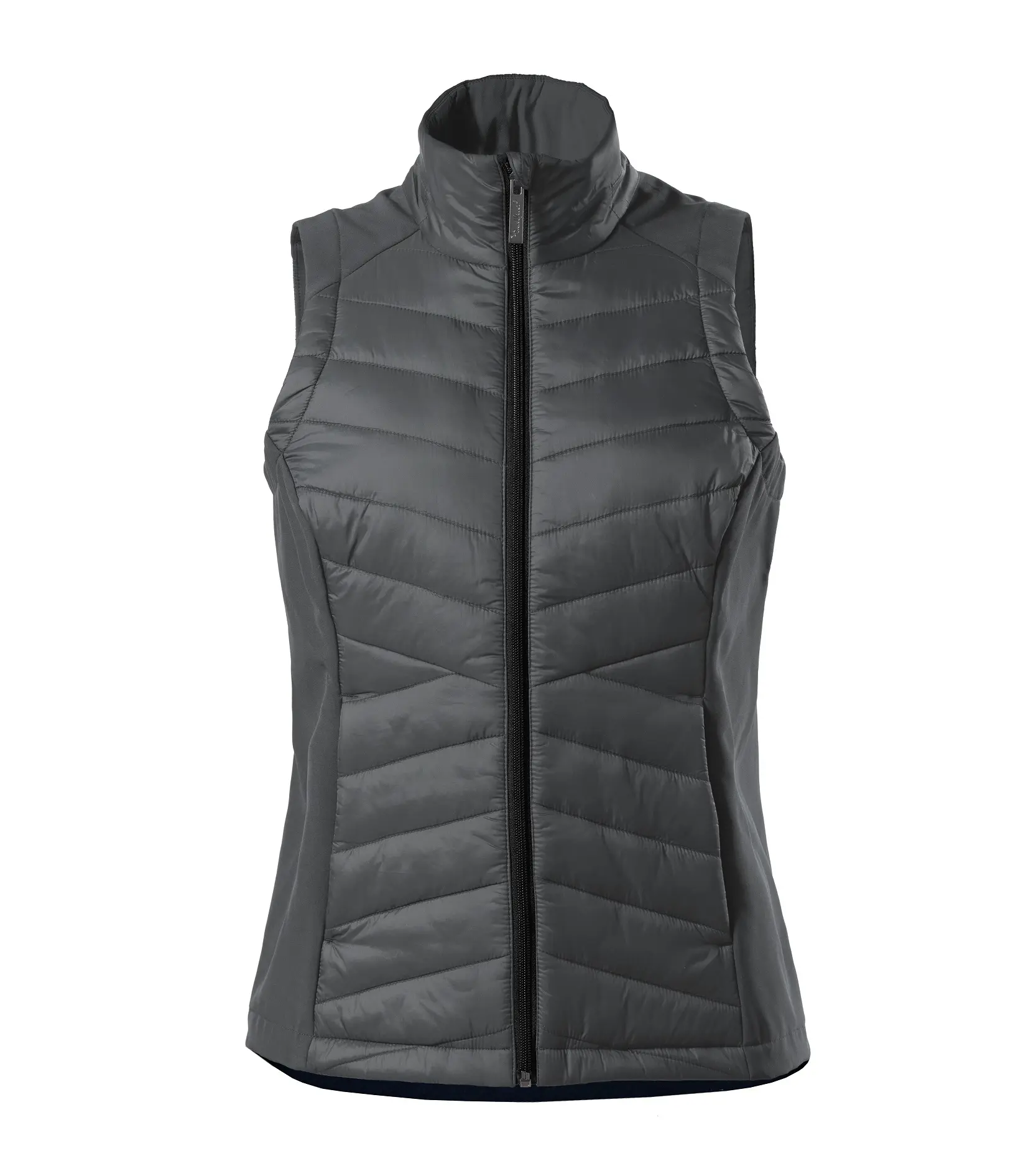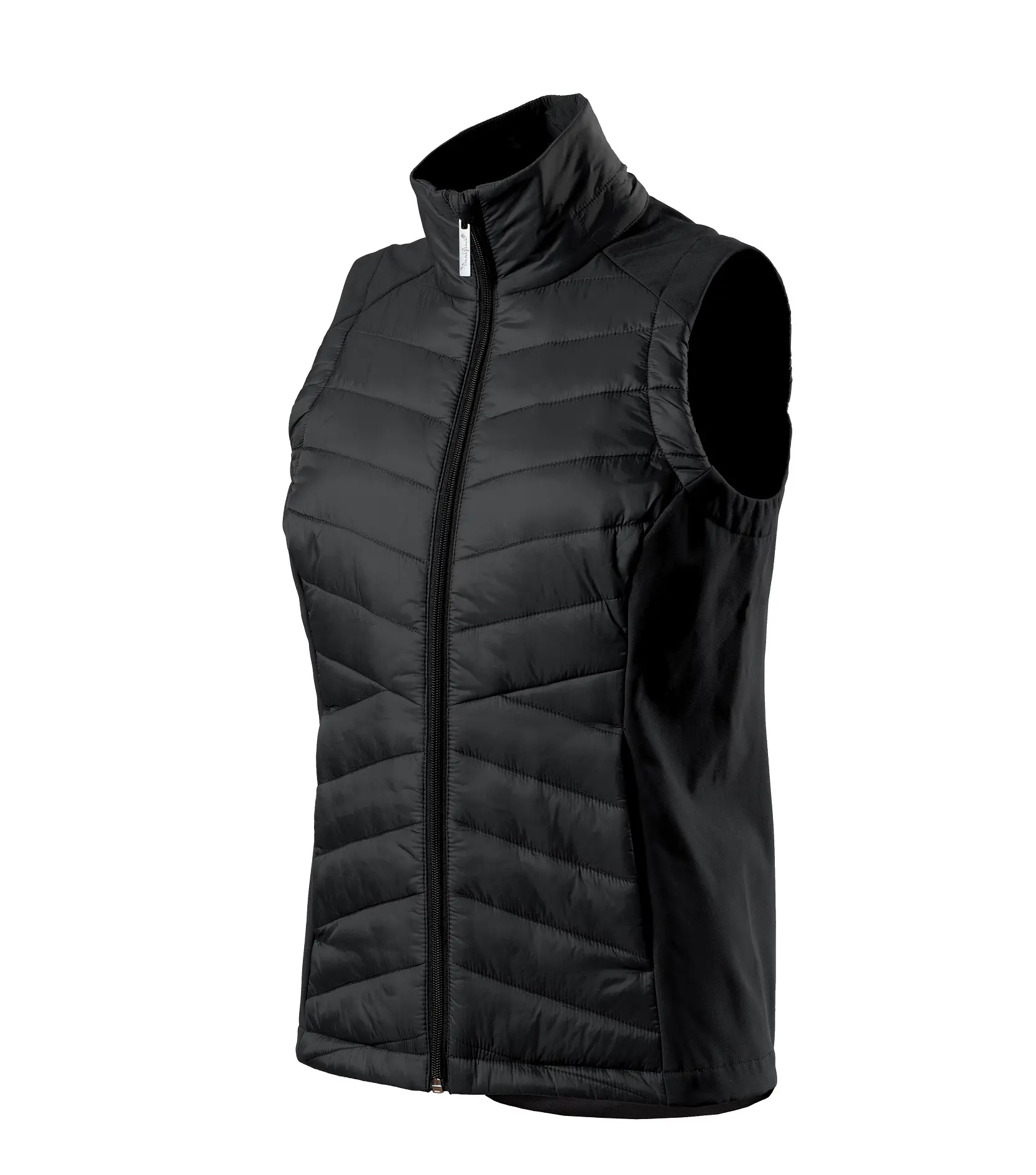 Vesta hybridní dámská zateplená plátnová vazba: 100 % polyamid, vodoodpudivá úprava, výplň: 100 % polyester, softshell: 90 % polyester, 10 % elastan, vodoodpudivá úprava, 250 g/m2, fleece: 100 % polyester, antipilingová úprava, kombinace prošívaného a softshellového materiálu. Rovný střih s bočními díly, celopropínací spirálový zip s krytkou brady, boční kapsy se spirálovým zipem, vnitřní náprsní kapsa na zip, tvarovaný a mírně prodloužený zadní díl, vstup pro branding v podšívce zadního dílu. Velikosti: S,M,L,XL,XXL