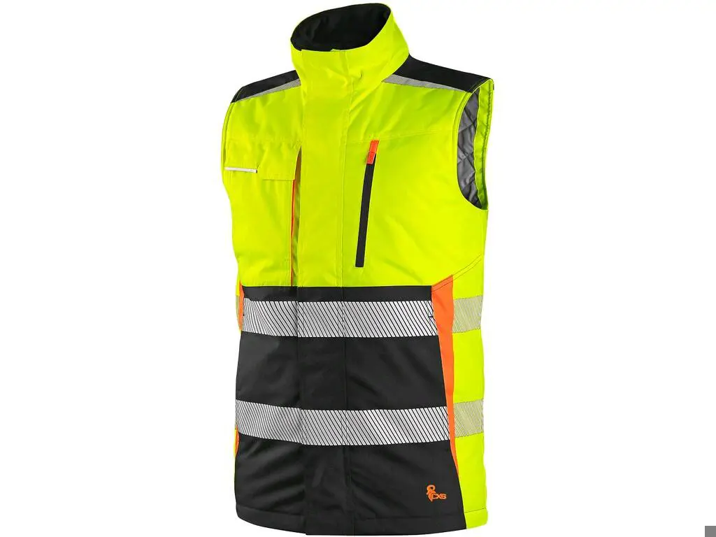 Pánská výstražná zateplená vesta, odolná proti vodě a větru, fleecový límec, kryté zapínání na zip a suché zipy, levá náprsní kapsa na zip, pravá krytá klopou, boční kapsy na zip, segmentované reflexní pásky, kontrastní oranžové a reflexní doplňky, vnitřní náprsní kapsa, stahování v dolním okraji, odolnost materiálu proti průniku vody 2000 mm. Materiál: Svrchní materiál: 100 % polyester Oxford, Výplň: 100 % polyester. Podšívka: 100 % polyester. Velikost: S-3XL