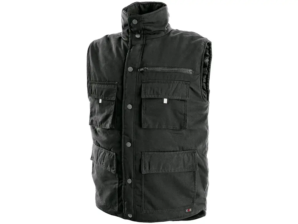 Pánská zateplená vesta s prodlouženým zadním dílem, zapínání na druky, 4 vnejší kapsy s klopou, náprsní kapsa na zip, reflexní doplňky. Materiál: 65 % polyester, 35 % bavlna, izolační výplň 100 % polyester, podšívka 100 % polyester. Velikost: S-3XL