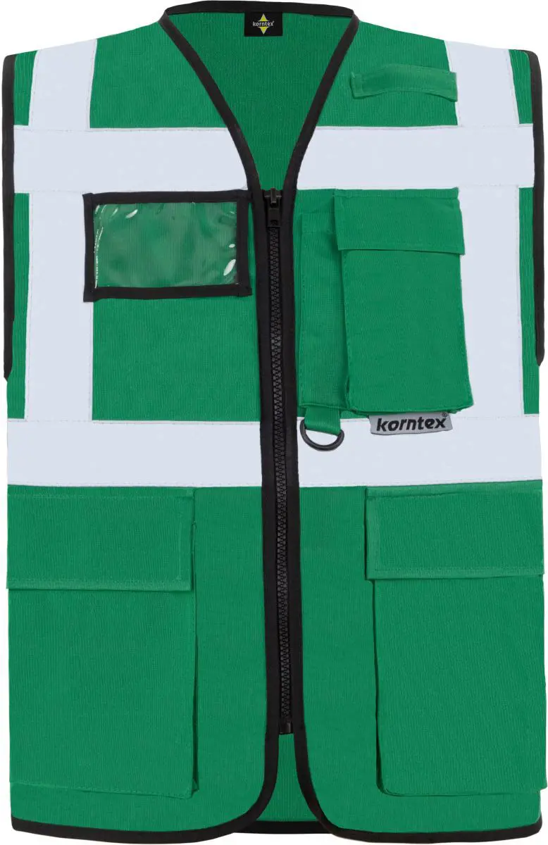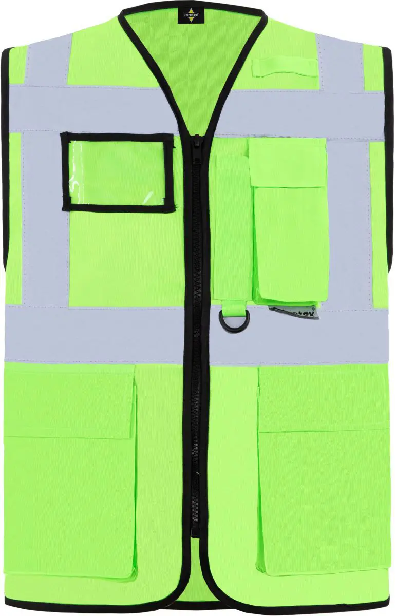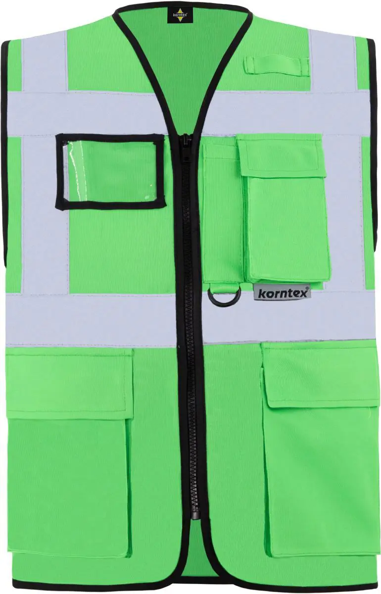 Multifunkční vesta. Plný přední zip, 2 kapsy s klopami na suchý zip, kapsa na doklady, kapsa na smartphone, přihrádka na pero, kroužek na klíče, neon pink a neon green certifikované podle EN1150, barvy yellow, orange, yellow/orange a yellow/blue odpovídají EN ISO 20471 (všechny ostatní barvy nevyhovují), čtyři reflexní pruhy široké 5 cm. Materiál: 100% polyester. Vel. S-5XL