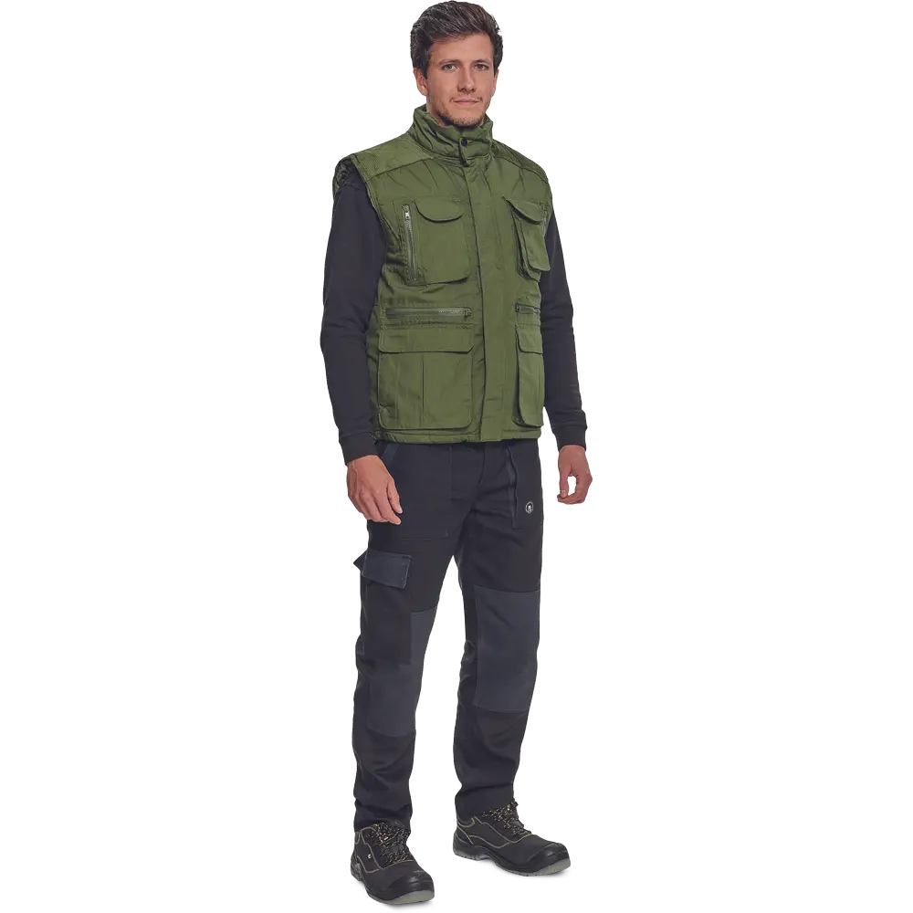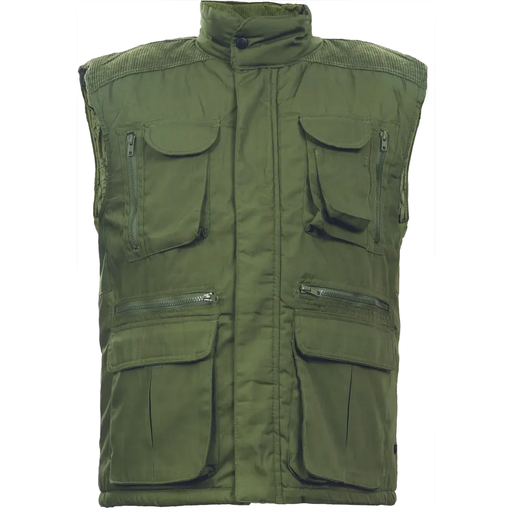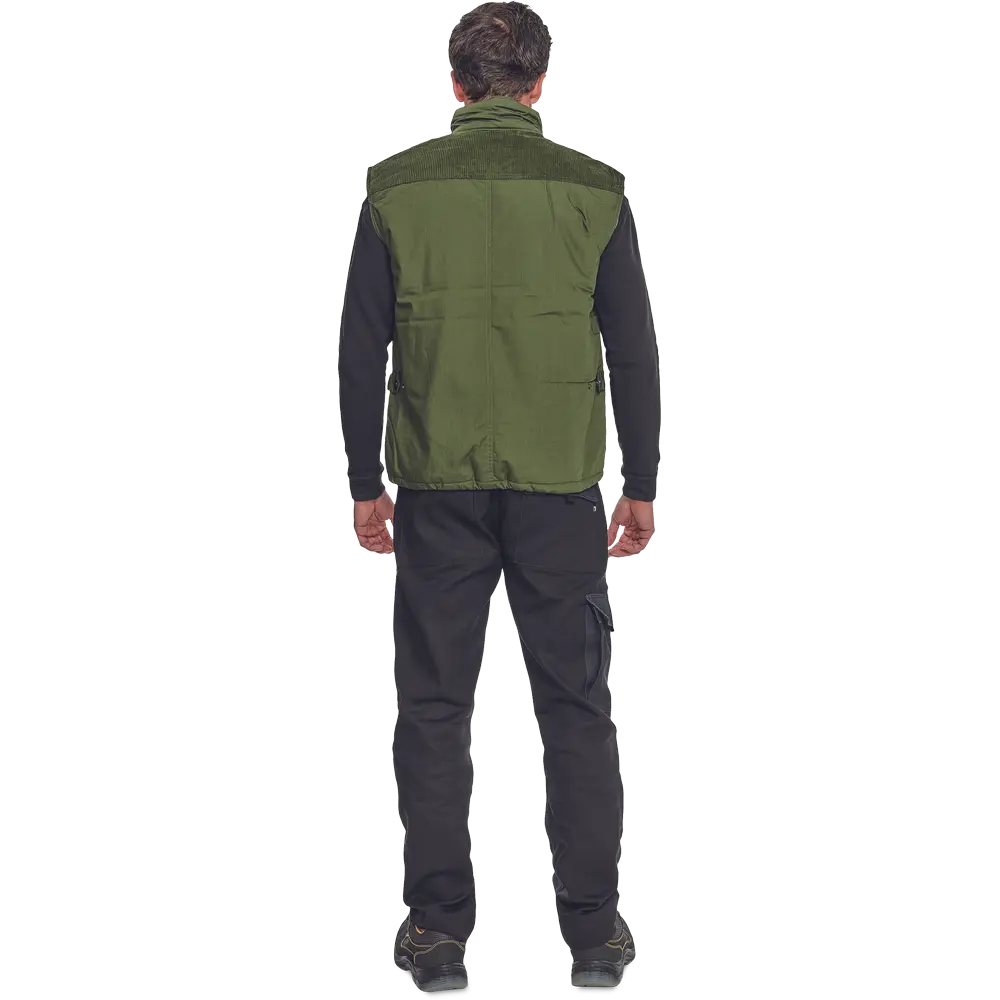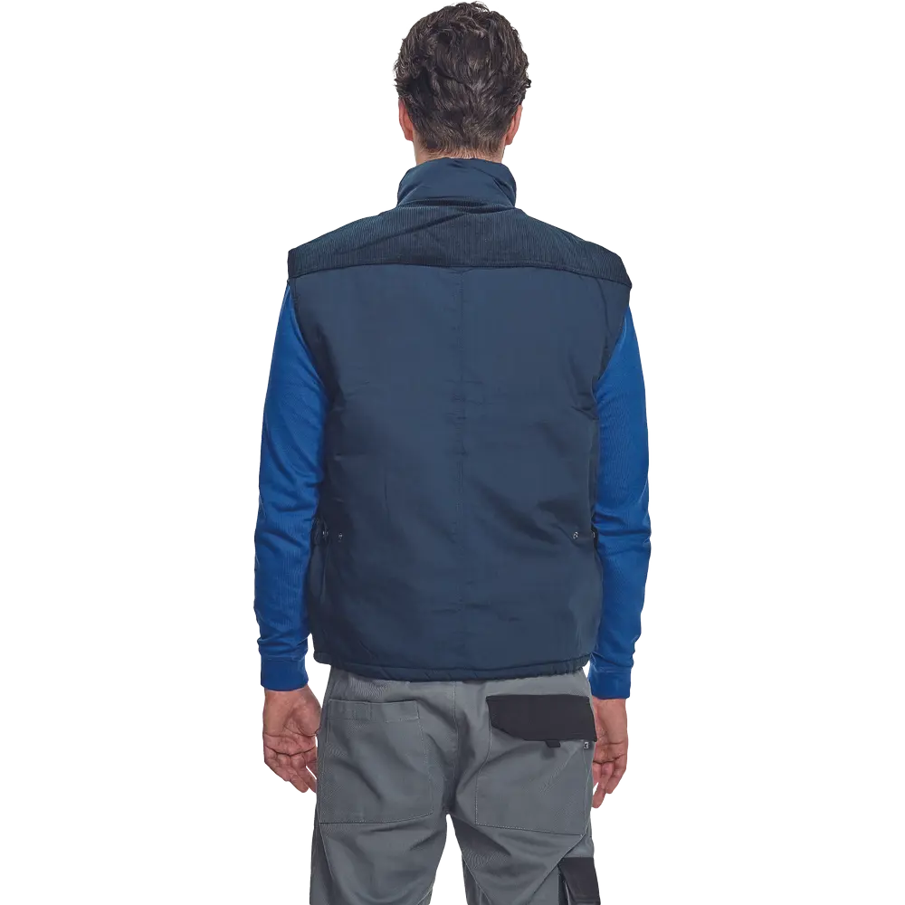 Léty prověřená a oblíbená zateplená vesta s manšestrovými nárameníky, vysokým límcem a mnoha praktickými kapsami. Možnost nastavení šířky vesty pomocí kovových druků, spodní lem ke stažení šňůrkou, vhodná pro potisk i výšivku