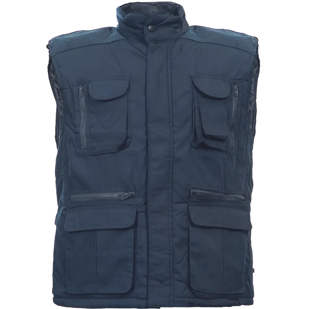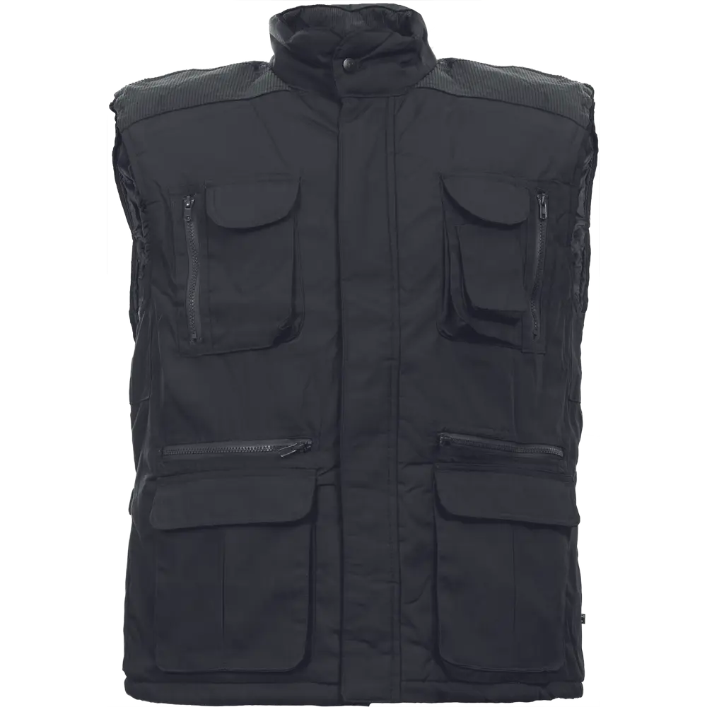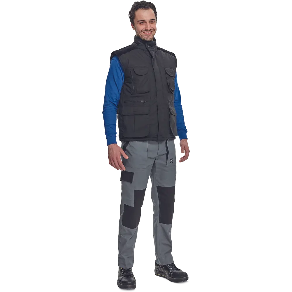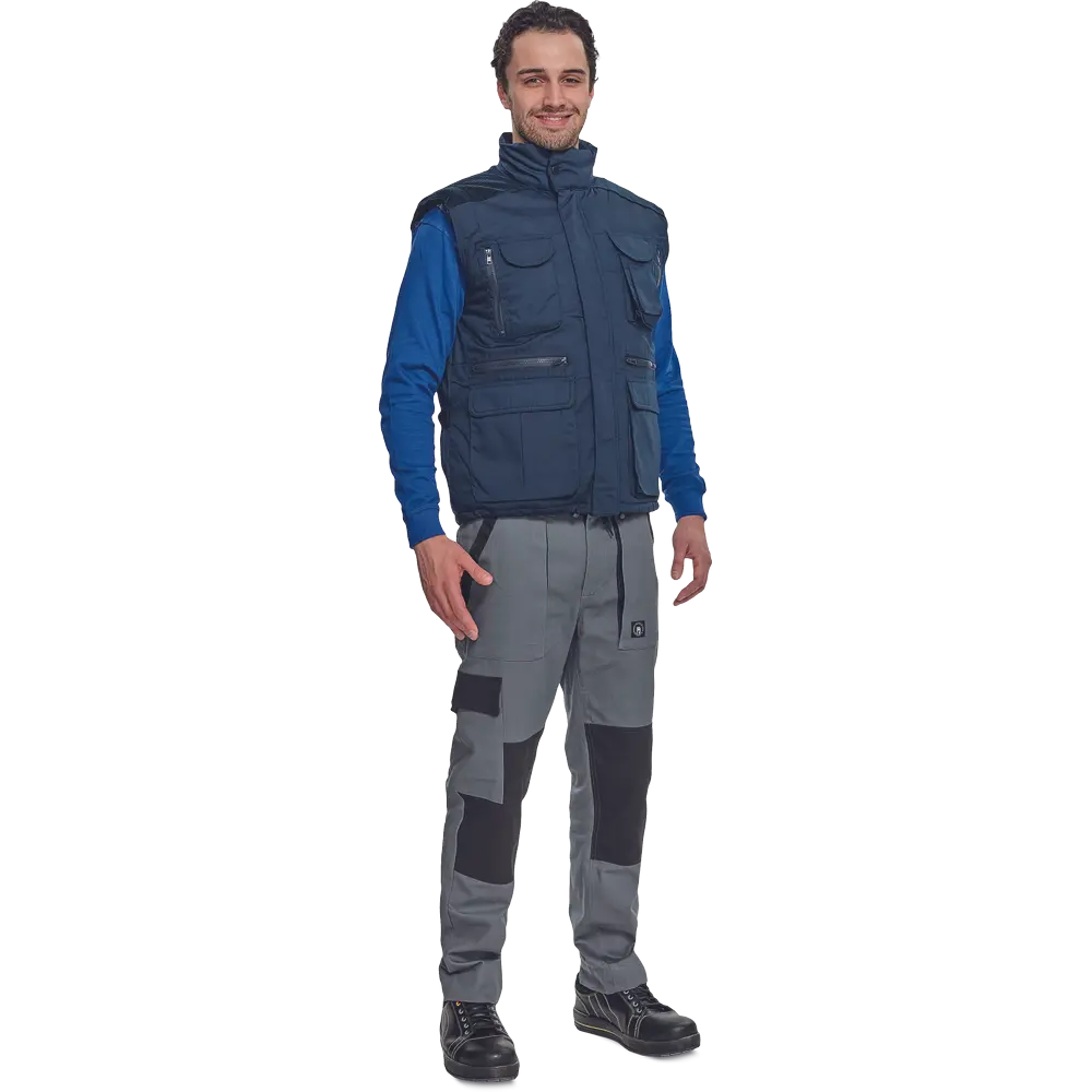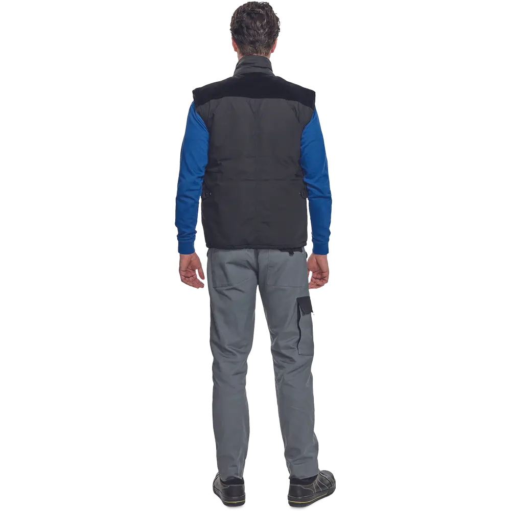 Léty prověřená a oblíbená zateplená vesta s manšestrovými nárameníky, vysokým límcem a mnoha praktickými kapsami. Možnost nastavení šířky vesty pomocí kovových druků, spodní lem ke stažení šňůrkou, vhodná pro potisk i výšivku